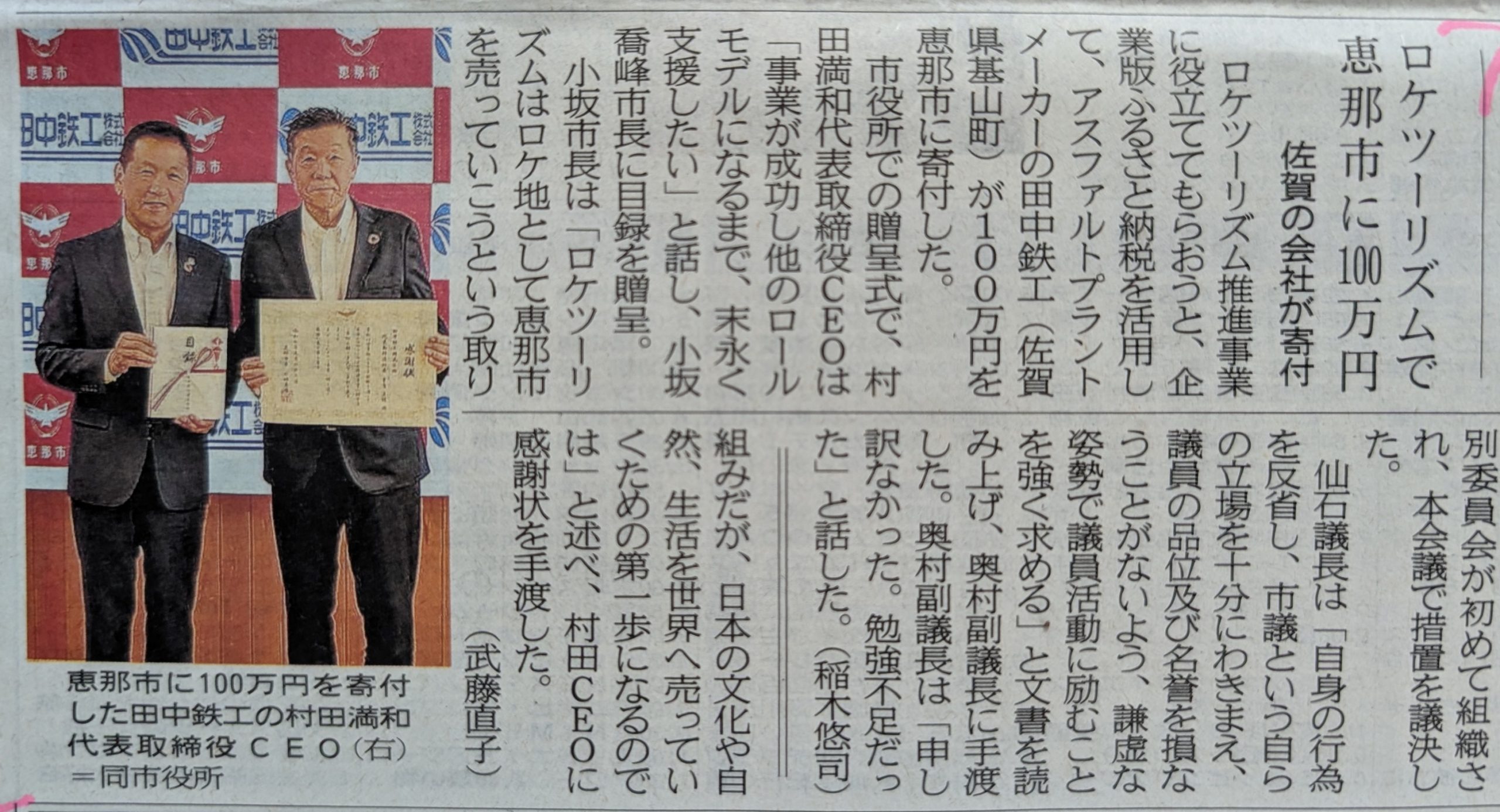 2025年9月22日(月)、田中鉄工から恵那市のロケツーリズムへ、企業版ふるさと納税(地方創生応援税制)の寄付目録および感謝状贈呈式が執り行われました。